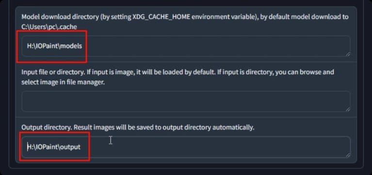 8、让我们继续滚动至页面底部,这里,你需要设置两个关键目录。首先,返回到IOPaint的根目录,然后创建两个新文件夹:”models” 和 “output”。”models” 文件夹用于存储从网络下载的模型文件,而 “output” 文件夹则用于保存生成的图片。接下来,请copy”models”和”output”这两个文件夹的完整路径。然后,在WebUI的相应路径栏中,分别将这些路径粘贴到第一个和第三个输入框内。