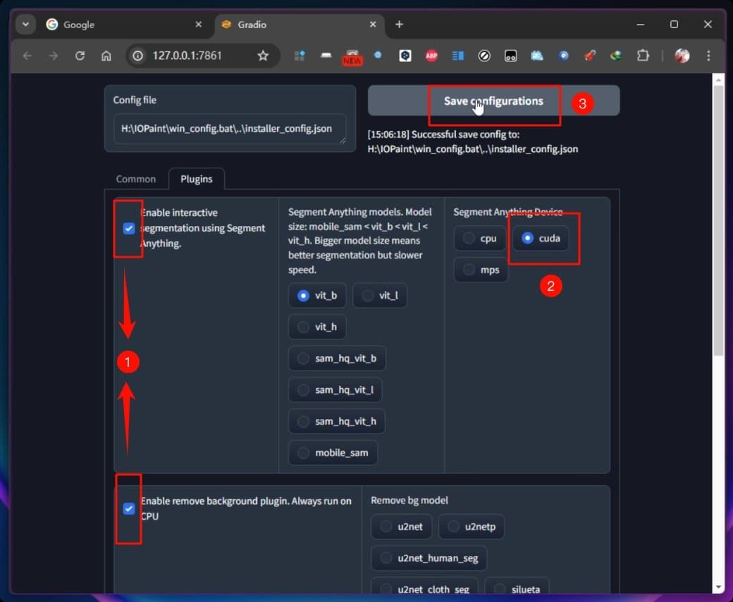 接着,让我们回滚到页面顶部,选择plugins插件选项卡,勾选启用全部插件的复选框,这些插件都是IOPaint自带的很成熟的功能,例如一键去背景、创建人物蒙版路径、AI无损照片放大等等,推荐全部启用。当然别忘了,将插件驱动力全部改为cuda。