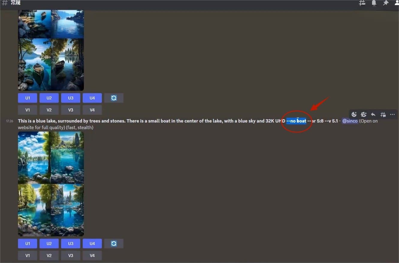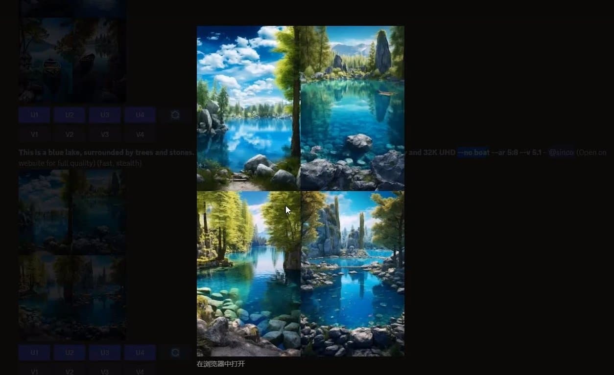 可以清楚看到这次生成的图片中就没有船的影子了,使用–no+想要去除元素–这一公式就能够轻松去除不想要的元素。