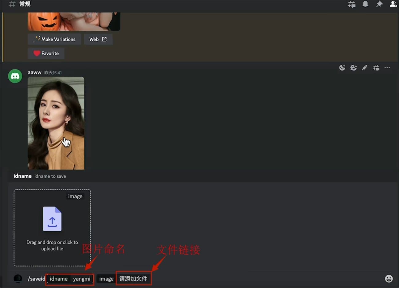 首先为图片命名,在idname后输入图片名称,数字或字母都行。一般不能超过8个字符。至于添加图片,我们可以直接复制图片链接,然后在imagine后将图片链接输入。