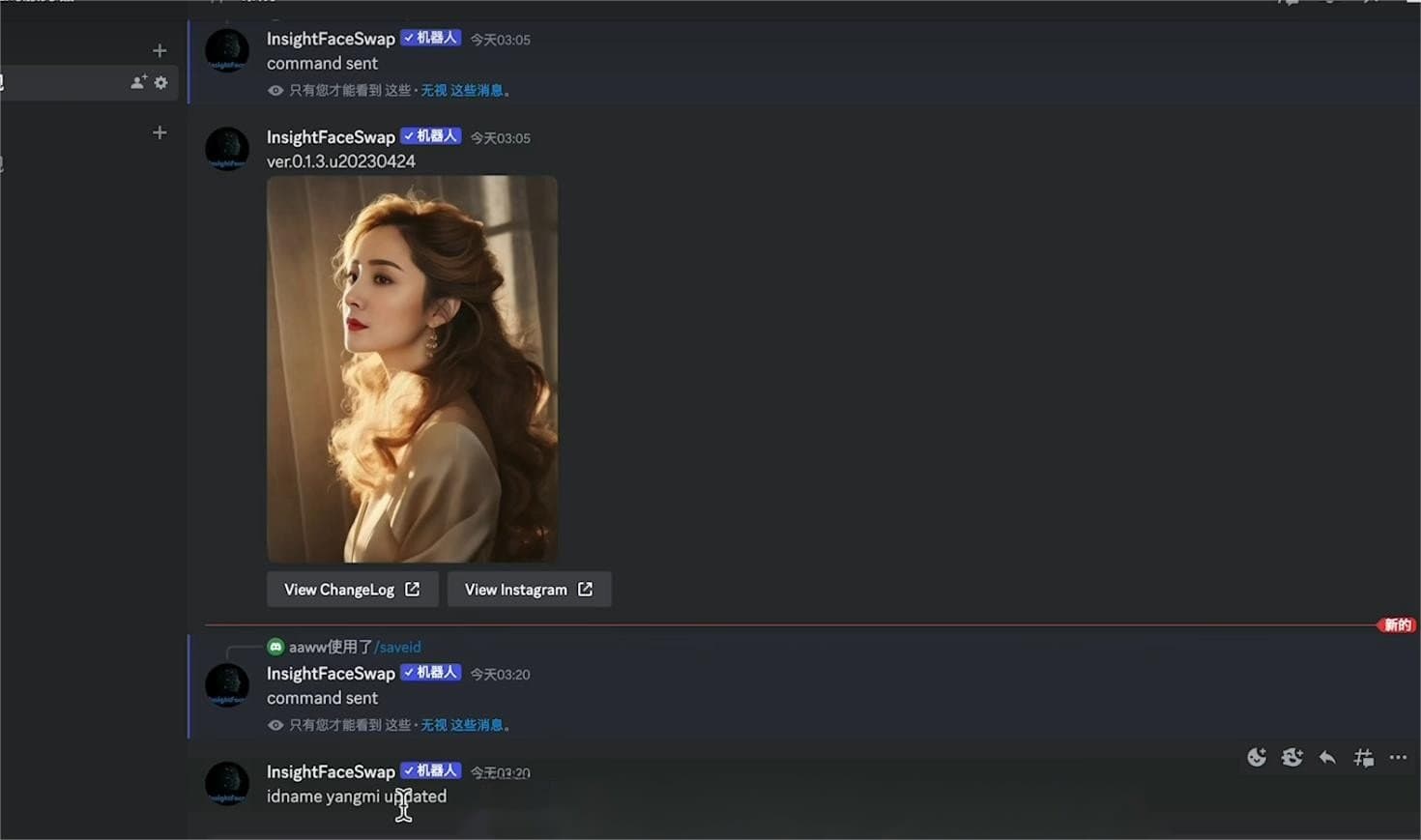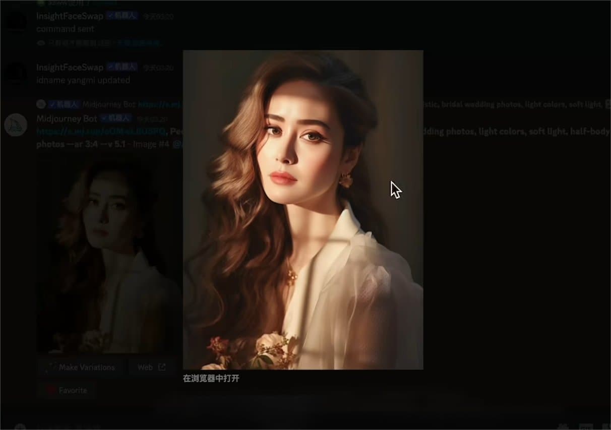 换脸后的图片已经有杨幂的大部分神韵了。可以说,相比于使用垫图或者seed来生成换脸图片,使用insight机器人生成的换脸图片更加相似,换脸步骤也更加简单。
