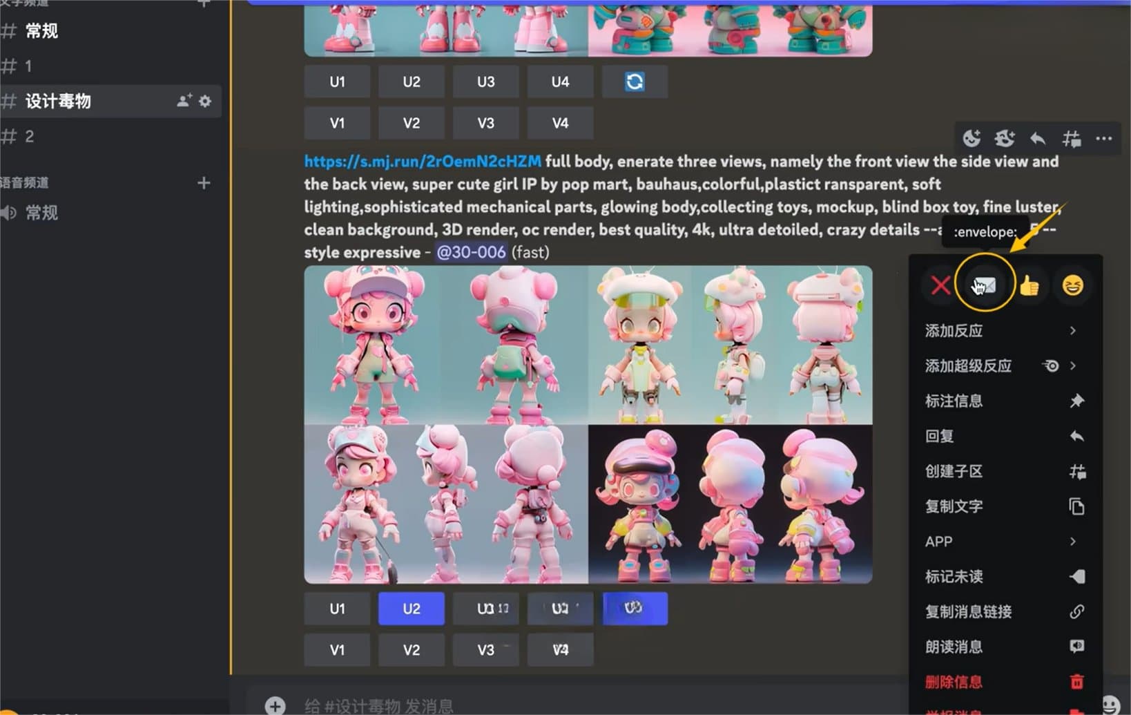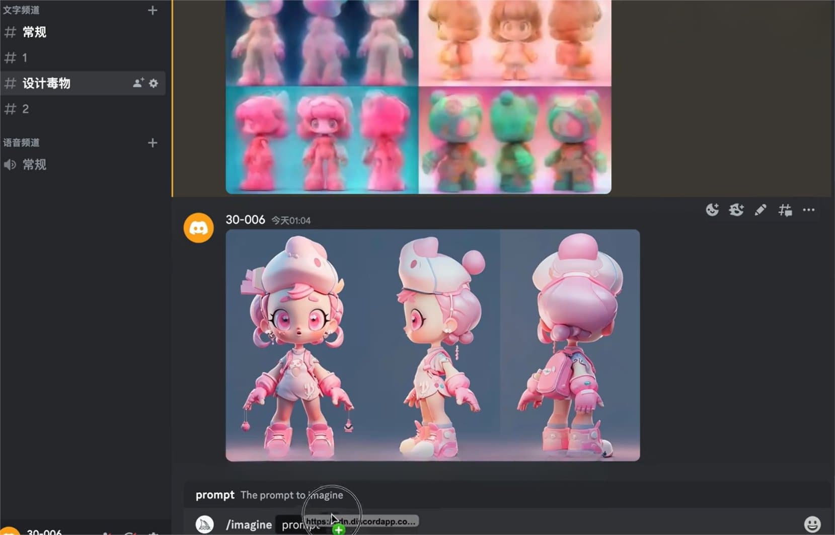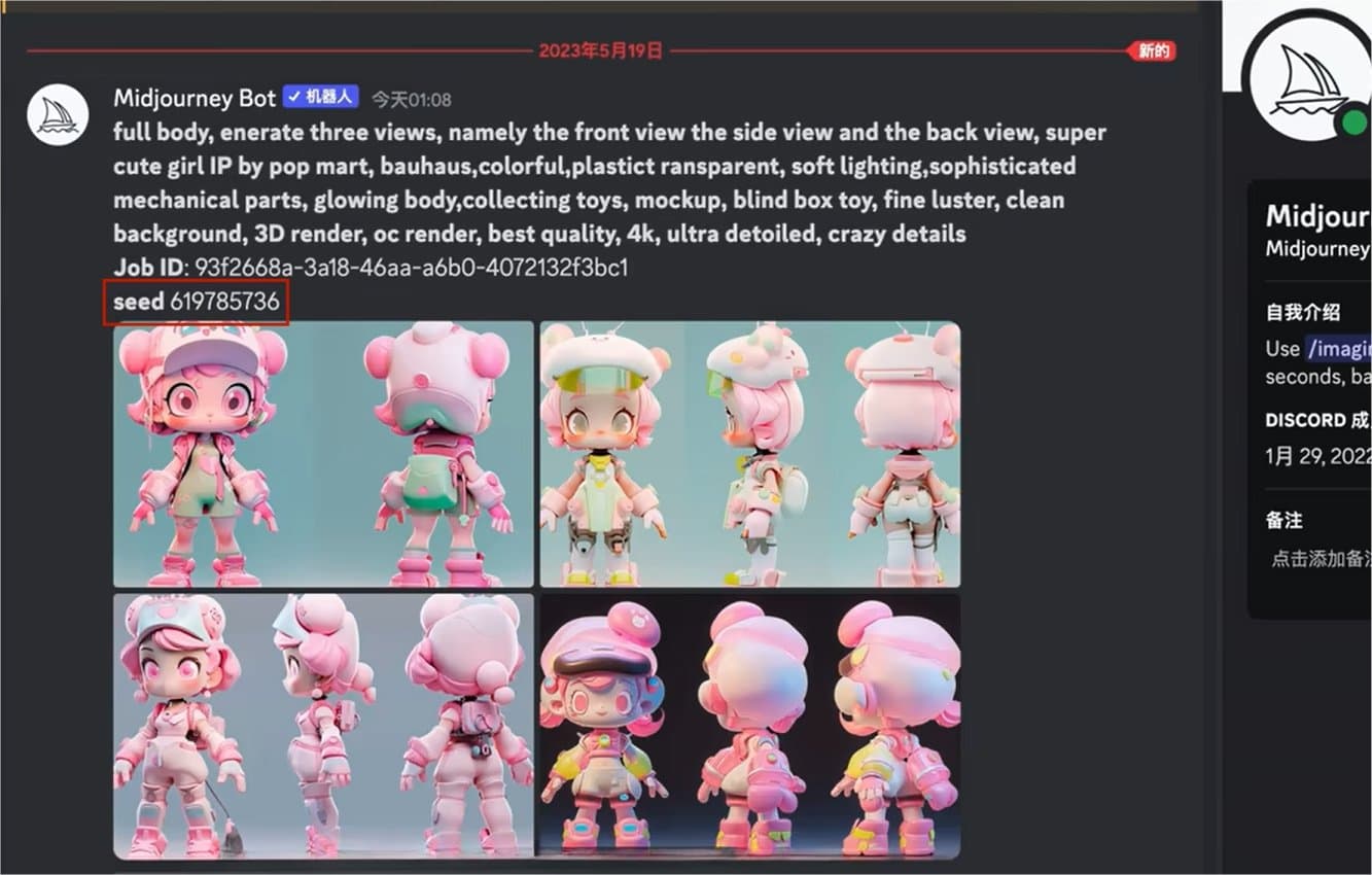 ·进入midjourney机器人页面,机器人会发出图片,并附有seed参数