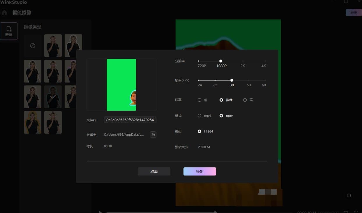 填写文件名,然后选择导出点。最后对视频导出后的分辨率以及帧率、格式等进行选择。选择完成后,点击导出,整个智能抠像的过程就完美结束了。