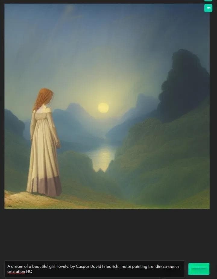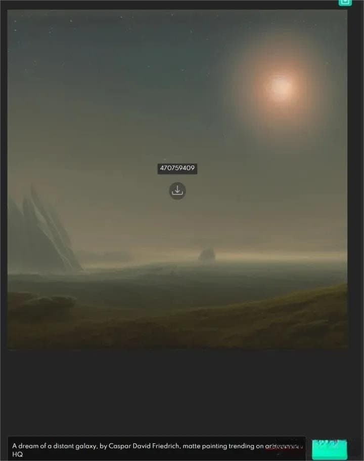 系统已经给了你一个默认的prompt(A dream of a distant galaxy, by Caspar David Friedrich, matte painting trending on artstation HQ),直接点击dream就可以生成你的第一张ai图片了。