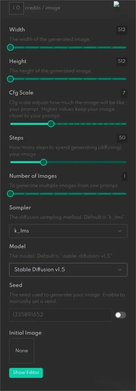 width height就是生成图片的长宽,默认是512×512,更大的图像消耗更多的积分credit,同时可能会造成图像显示的异常。建议初学者不调整此项。如果你要高清图,可以用生成的图片去找一些增强算法来提高分辨率。