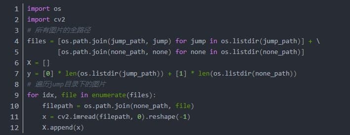 收集完成后我们就可以把图片读入,并转换成一个1维数组,这部分代码如下: