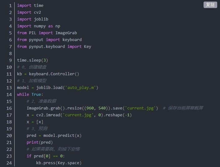 知道了如何控制键盘后,我们就可以使用模型截取预测,如何判断是否要按空格,代码如下: