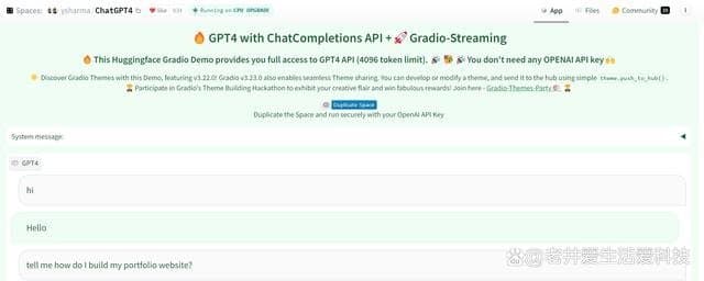 Chat-with-GPT4是一个托管在Hugging Face上的网络应用。它连接到OpenAI API,让你免费体验GPT-4。由于需求量大,你可能会得到较慢的回应,但如果你足够耐心,你总会得到回应。