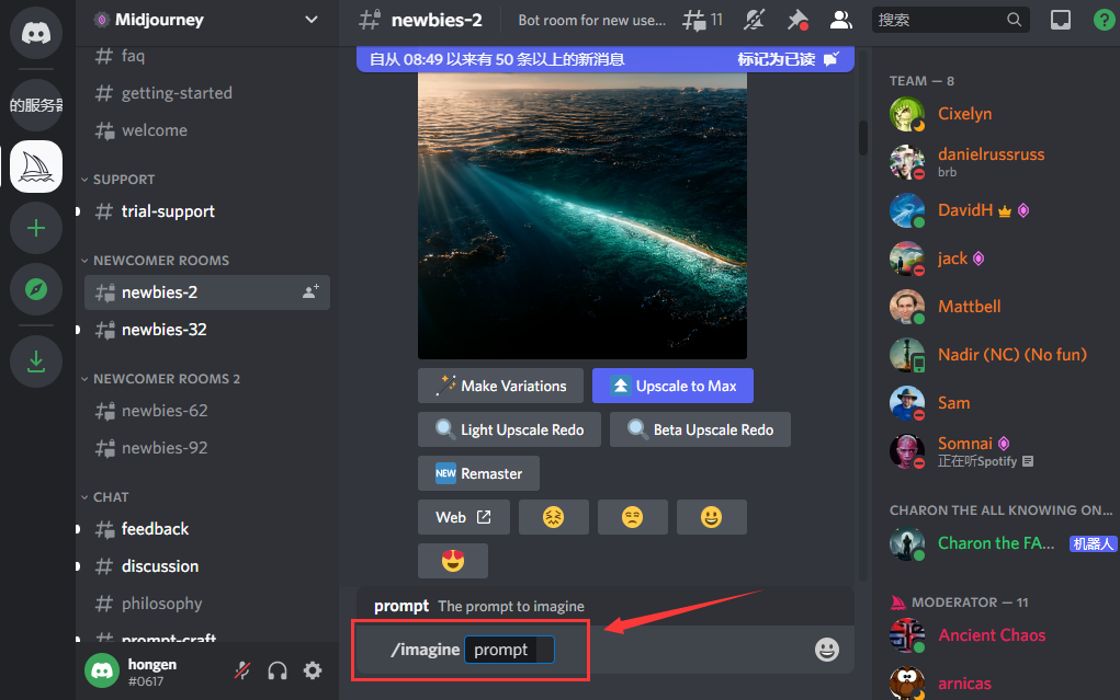 第五步: 输入/imagine后按回车键,然后在输入想要生成图片的文字描述,等待Midjourney机器人处理你的需求。