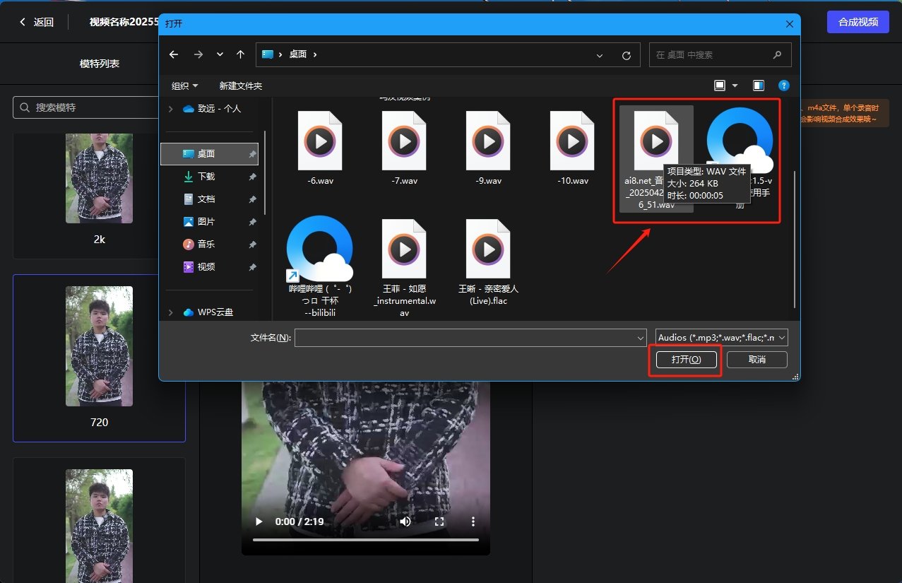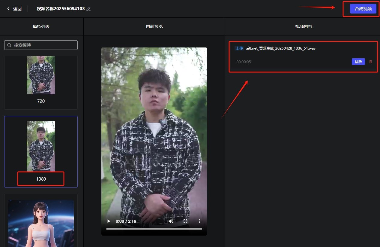 按照以上方法分别导入720P、2K、4K;导入完毕后在我的数字人模特中就可以看到需要的素材。在测试中逐一进行视频合成。点击做视频上传需要的音频文件,这边实例统一5秒钟音频。