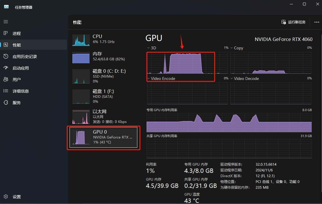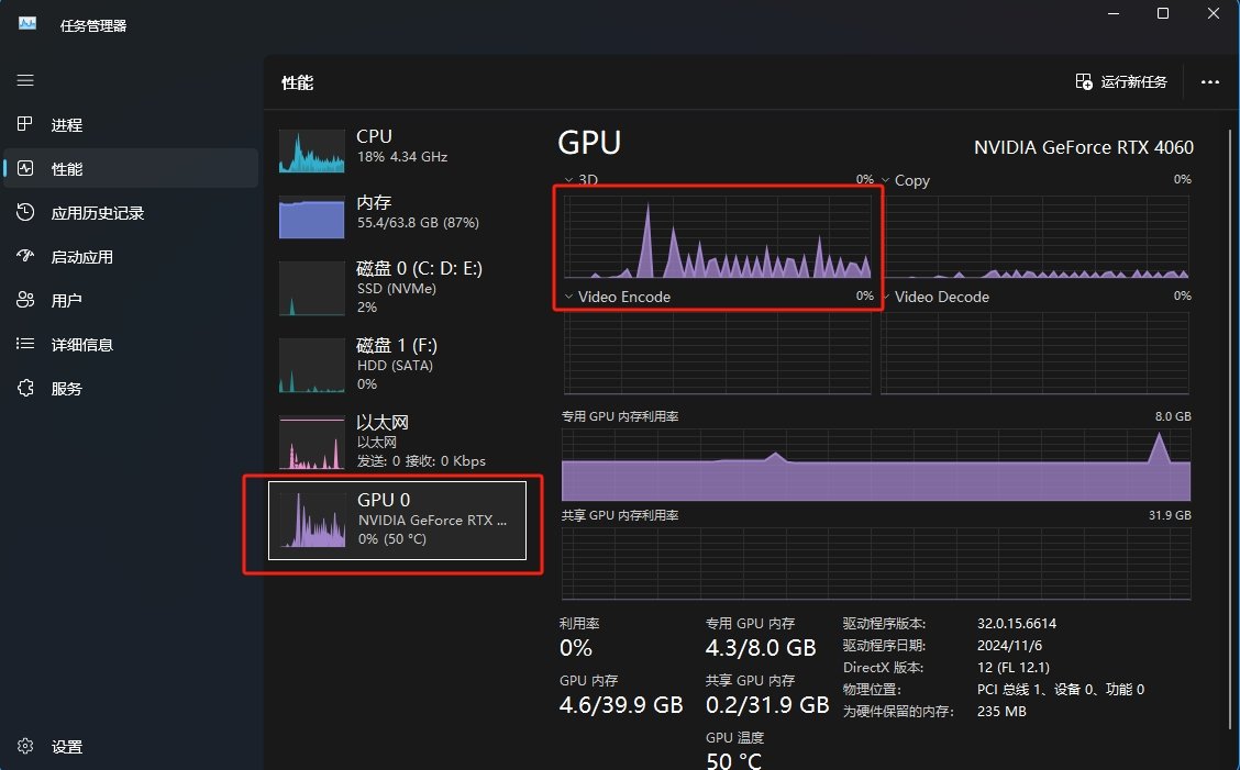 资源占用:在CPU中可以看到利用率约为58%,独显大小从7.4GB将至4.4GB;后期出现短暂内存交换。