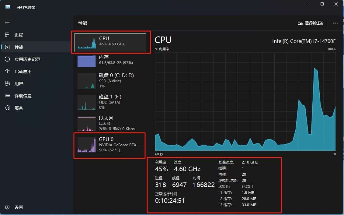 资源占用:在CPU中可以看到利用率约为45%,独显大小从4.6GB提升至7.4GB;后期出现短暂峰值交换。