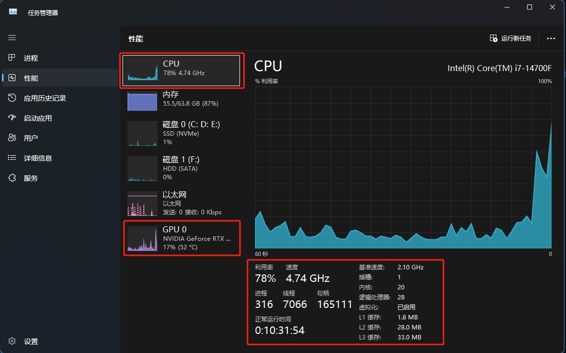 资源占用:在CPU中可以看到利用率约为78%,独显大小从5.5GB将至4.3GB;最高峰值21%后期出现锯齿状峰值表现出视频在逐步生成。