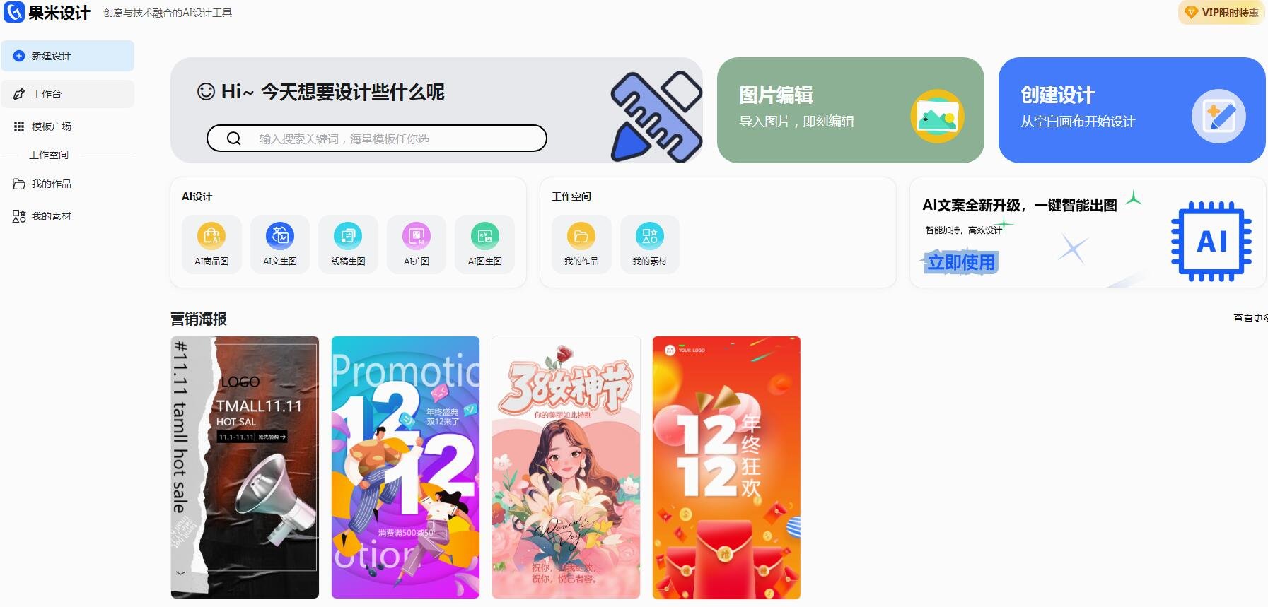 这是一站式ai创作平台,既可帮助我们免费生成海报提供海报设计,这样的智能功能,也提供了视频生成,以及ai图片的功能,里面拥有超多的素材库,满足每个领域想要制作图片的需求。