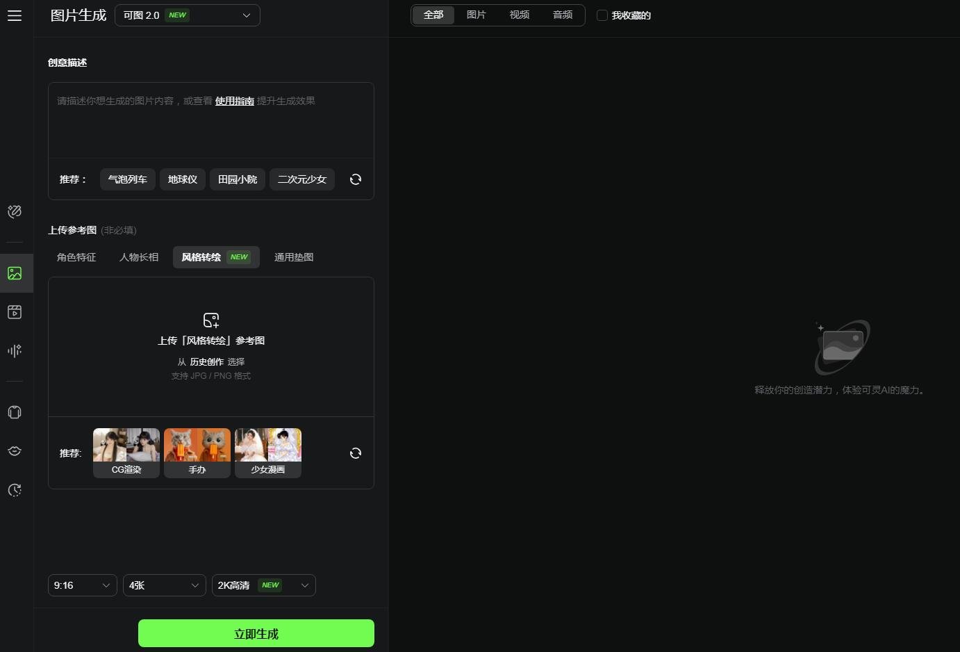 这款软件除了能帮助我们完成海报的一键生成,可以轻松完成海报的设计以及制作,更是一款ai图片生成工具和平台。无论在制作图片或者是海报时有着怎样的要求,都提供10多种不同风格高清的画作生成,其中就包括写实、水彩、动漫等。