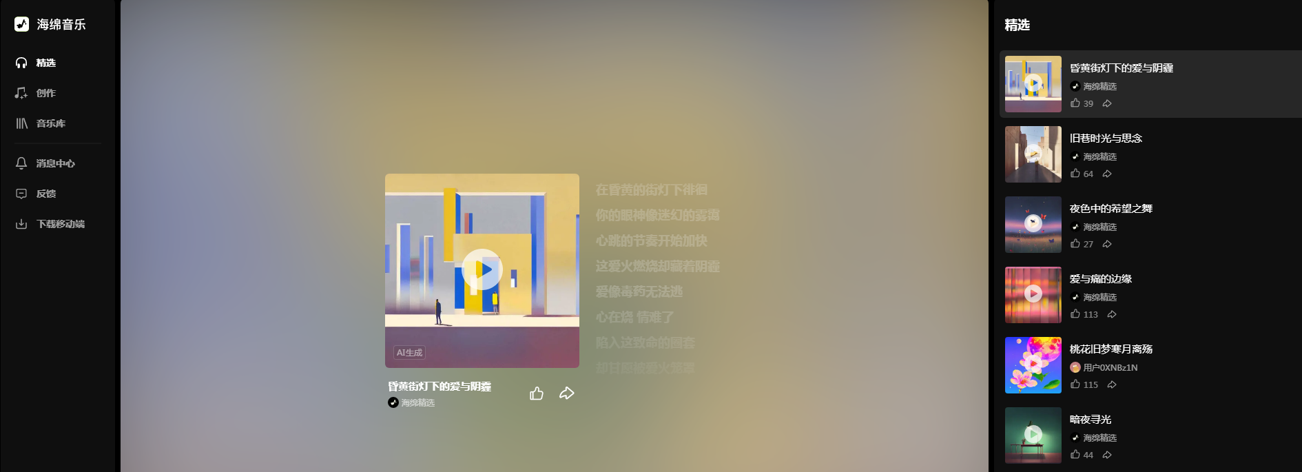 所有的功能都可以免费使用,只要输入相应的歌词和关键词就可生成原创的歌曲,还支持了在线聆听的功能,在试听的过程中,对于不满意的地方可进行调整和修改。在视频配乐以及商业领域中,特别适用。