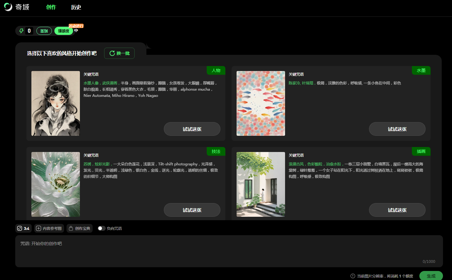 以及展示等多种功能为一体,专注于中式美学以及中华文化的绘画创作平台,简约的画面,简单易上手的操作方式,只要输入简单文字,就可生成高质量的绘画作品,比如有精巧刺绣或者名家水墨等。