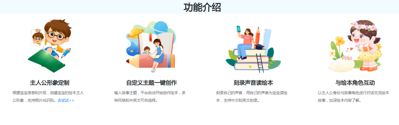 基于最新ai技术所推送的绘画绘本生成软件,可自定义其中主人公形象支持照片ai识别,可上传宝宝的正面照,几秒钟就能生成绘本中的主角,打造出可读性极强的艺术品。
