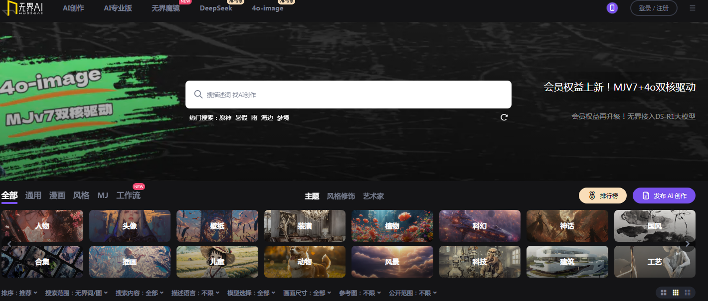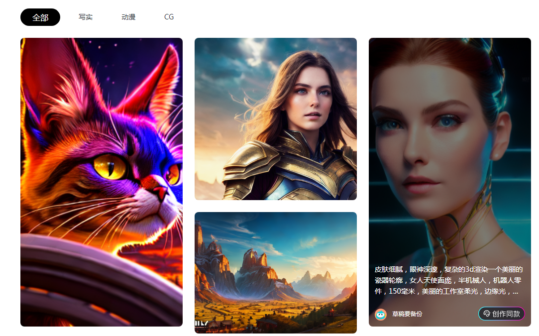 360推出的ai生成图片与插画工具,输入相应的关键词,或者上传图片生成不同风格艺术作品,有当前比较热门的写实风格,也有动漫、cg风格,满足不同的审美需求。