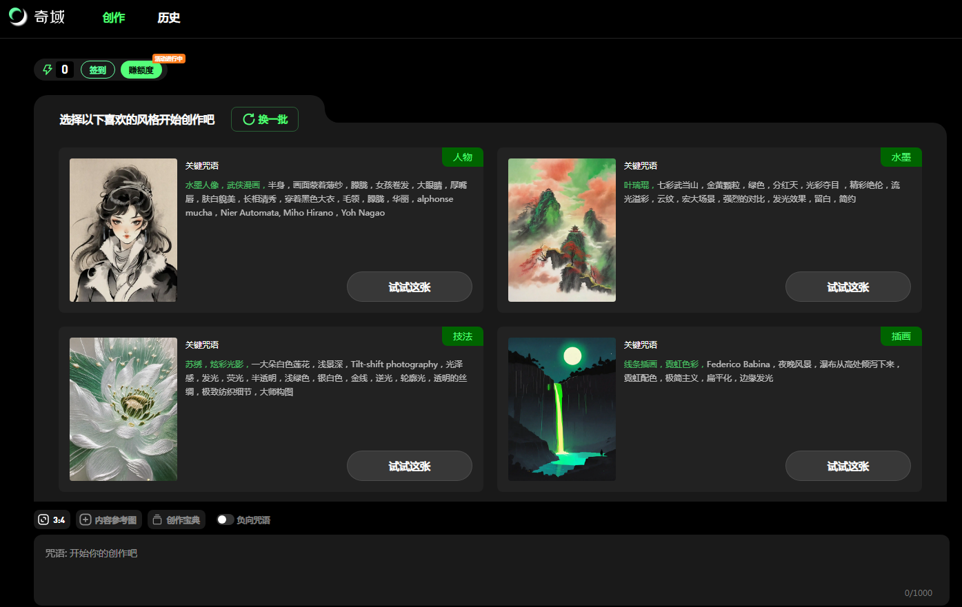热门的国产ai绘画工具,提供丰富多彩的艺术创作,让创作无界限,支持多种绘图风格,比如科技、二次元、神话等,每种风格有丰富的分支选项,让创作变得更个性化。推送出ai咒语生成器,这样的特色功能提供人物、五官、镜头、色彩等多描述维度。