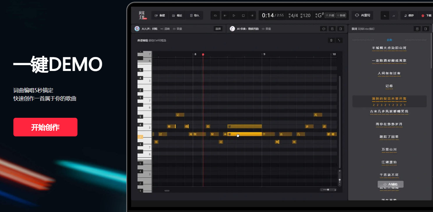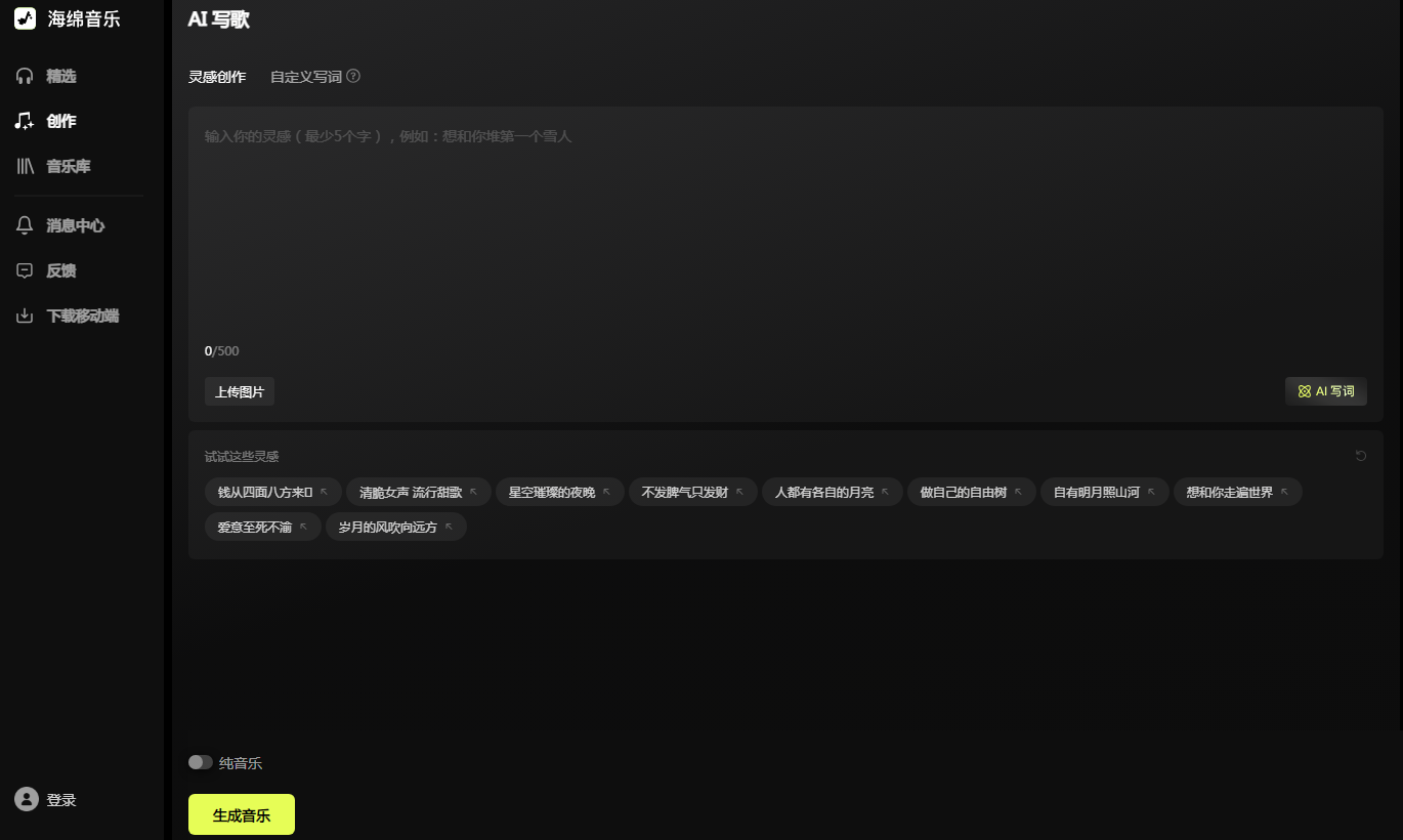 有多样化特色音乐风格,比如摇滚国风,丰富的音乐种类,根据个人情感状态自由选择。提供非常全面的ai生成歌词功能,根据所输入的特定灵感与关键词快速制定歌词,系统将生成符合要求的歌词与配音。