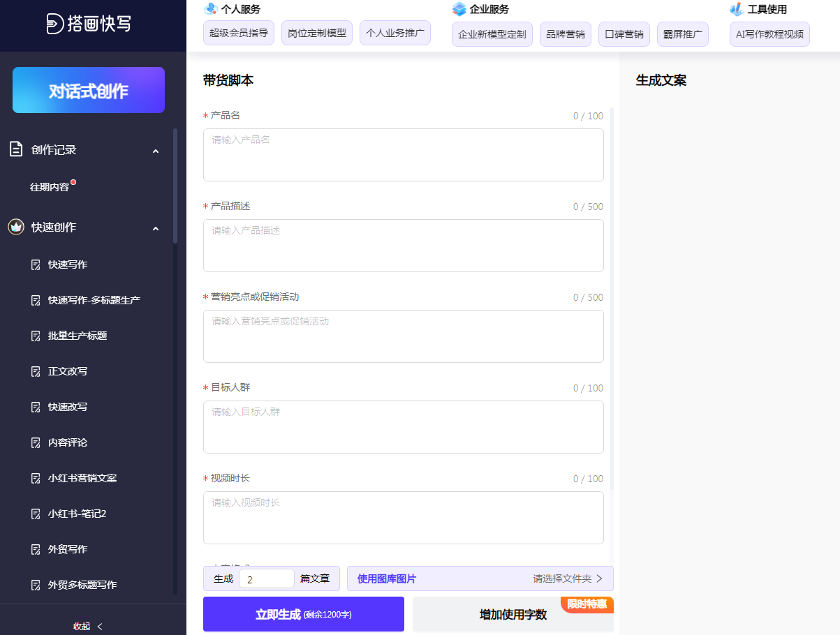 综合性文章生成内容优化软件,没有创业灵感,更没有华丽的语言在这款ai应用的协助之下,轻松生成。多语言支持,包括中文英文等,为全球用户提供优越的服务,高质量输出模式语法正确,满足不同用户的写作需求。