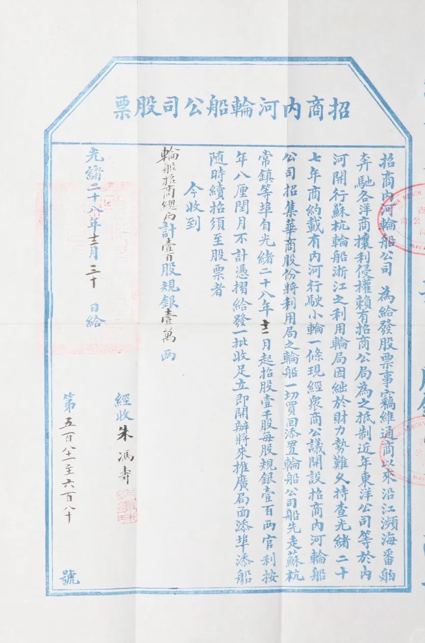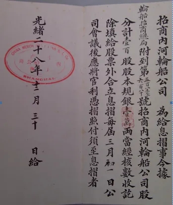 中国航海博物馆收藏的招商内河轮船公司股票,时间为光绪二十八年(1902),是公司初创时发行。股票为雕版蓝印腰牌形双线公文框,首行居中自右向左印有公司股票名称《招商内河轮船公司股票》。