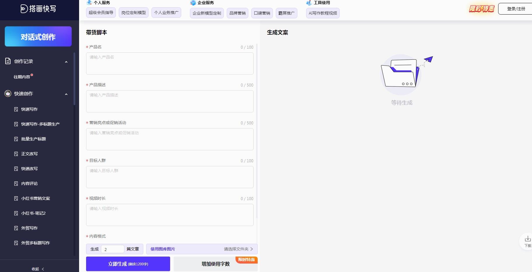 此ai文案写作工具可以帮助你在没有任何灵感甚至是不会写作的时候可以迅速的完成生成。在编写这方面的效率能够提升很多,无论是从事文章博客创作或者是商业文书写作的都可使用。