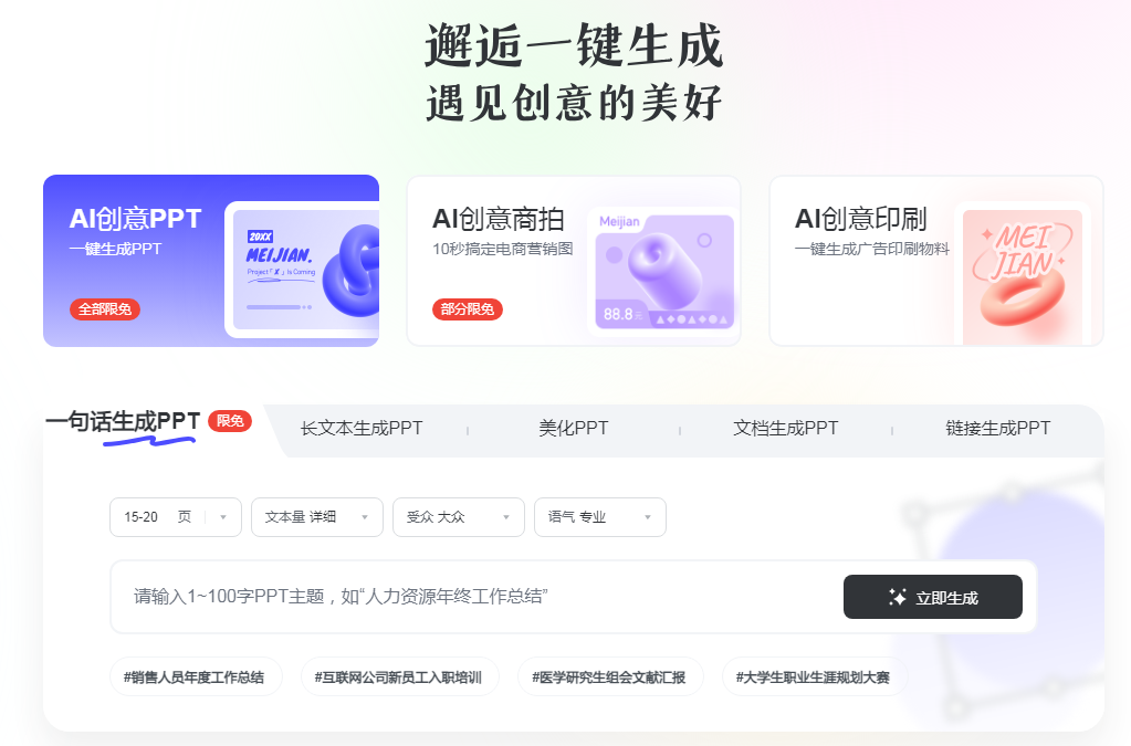 在整个ppt领域当中,有提高的热度,丰富的模板,涵盖多种特色场景与需求,用户根据自己的喜好选择适合的样式。使用方法相当简单,只要输入相关目标与需求即可快速生成ppt内容,从最初的输入到之后的输出,整个流程简洁又高效并足够顺畅,极大程度节省用户的时间。生成的ppt结构严谨,逻辑性极强,能够高效传达相关信息,满足日常办公的所有需求。